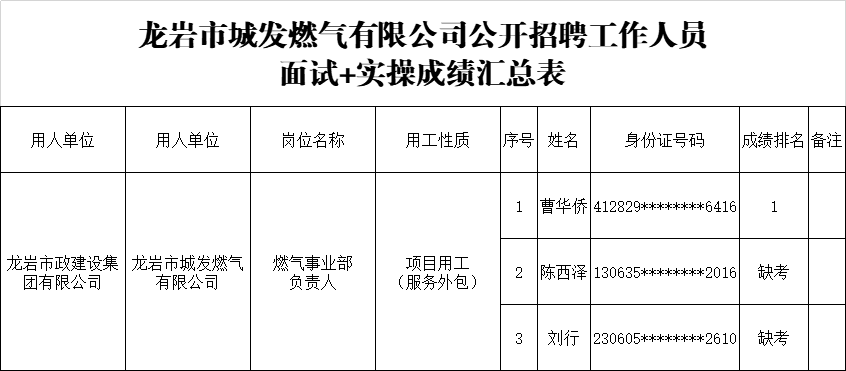 龍巖市政建設(shè)集團有限公司所屬企業(yè)公開招聘工作人員擬錄用公示 根據(jù) 2025年4月21日發(fā)布的《龍巖市政建設(shè)集團有限公司關(guān)于公開招聘工作人員的公告》有關(guān)要求,經(jīng)報名、資格審查、組織考試、體檢、考察等程序,現(xiàn)將龍巖市城發(fā)燃氣有限公司燃氣事業(yè)部負責(zé)人崗位擬錄用人員名…